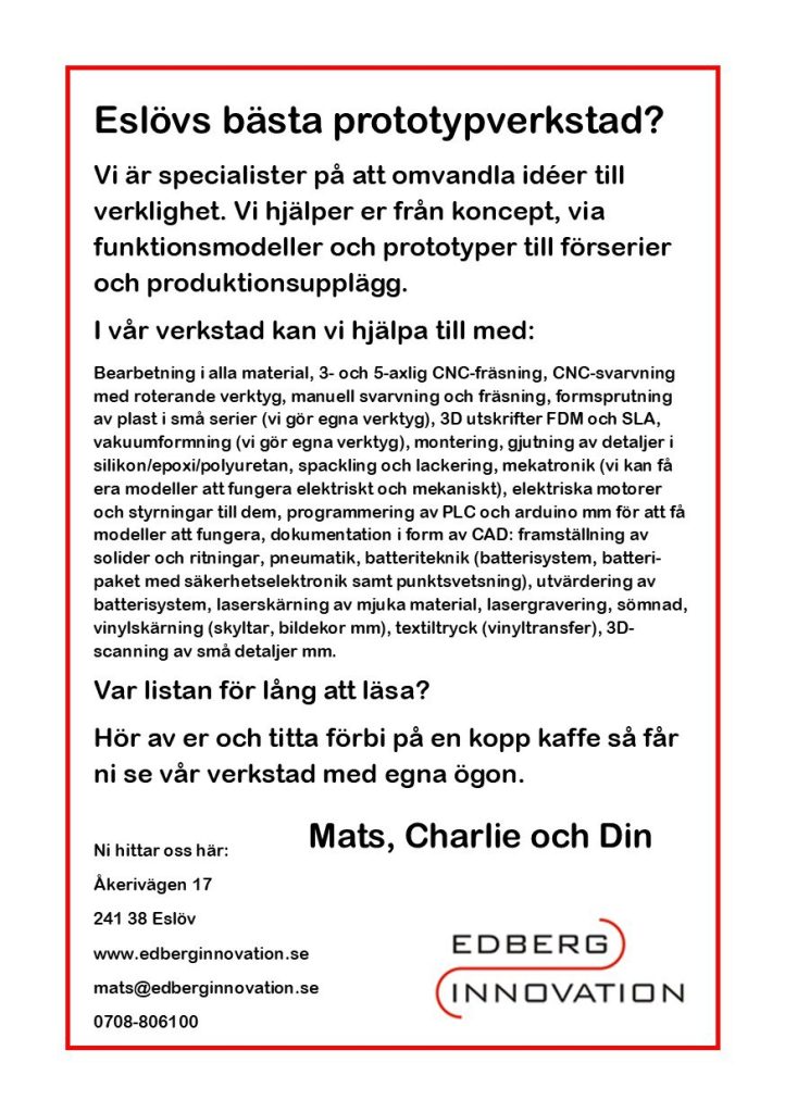 Till vår hjälp har vi bla CAD/CAM, 3D-printers, 5-axlig bearbetning, elektroniklabb, mekaniklabb.
